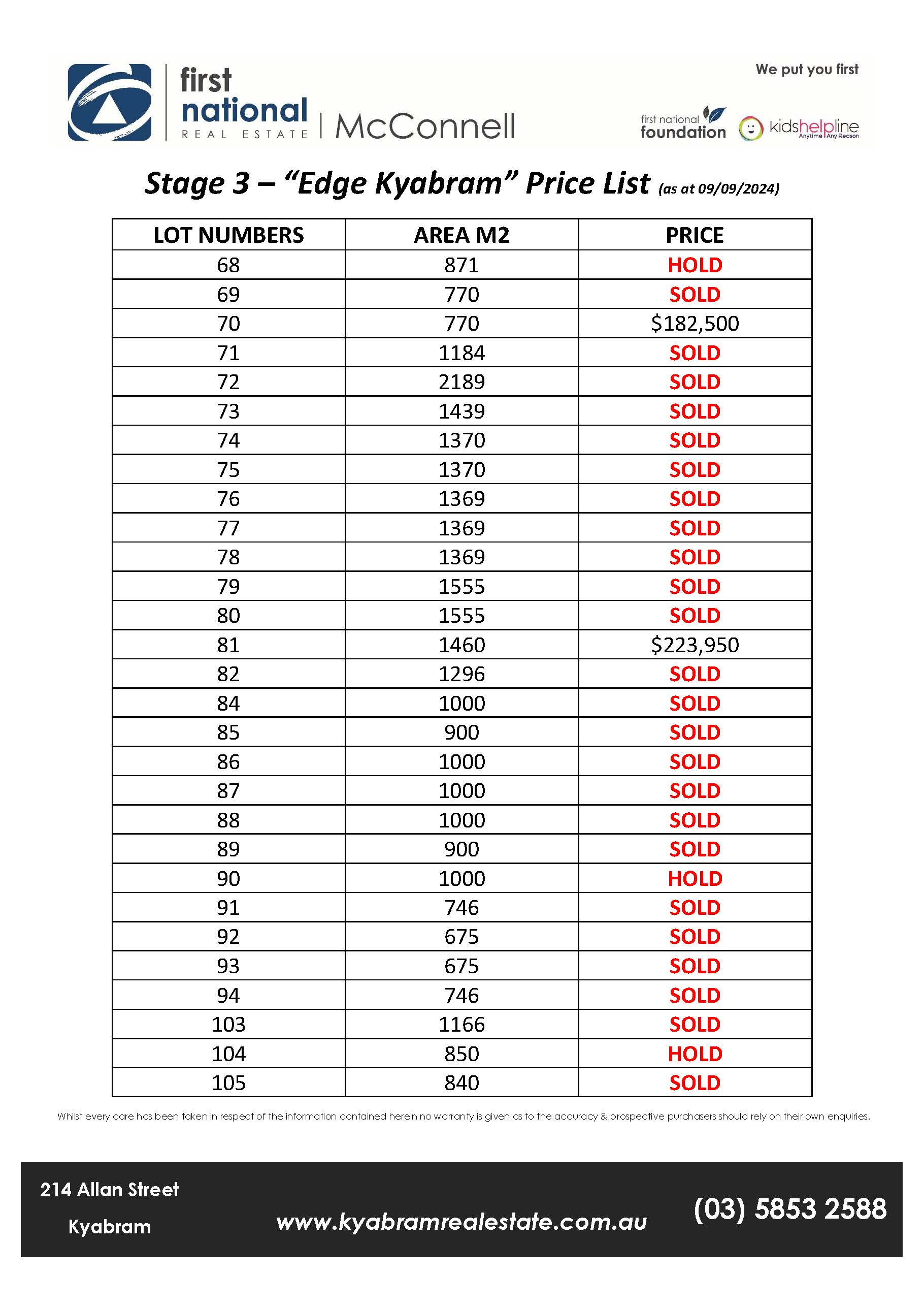 Stage 3 – Selling Now Benchmark living for Kyabram – This master planned estate will offer extensive greenery & parklands, wide tree lined streets with a large variety of blocks to suit any lifestyle. Fully serviced lots ranging from 675m2 – 2189m2, concrete crossovers, rear boundary fence included in sale price. Protective covenants to ensure a quality environment for family living. Get in early to secure your preferred lot. Call Brendan 0407 344995 or Tom 0457 771813 to look at plans & discuss your options. www.kyabramrealestate.con.au